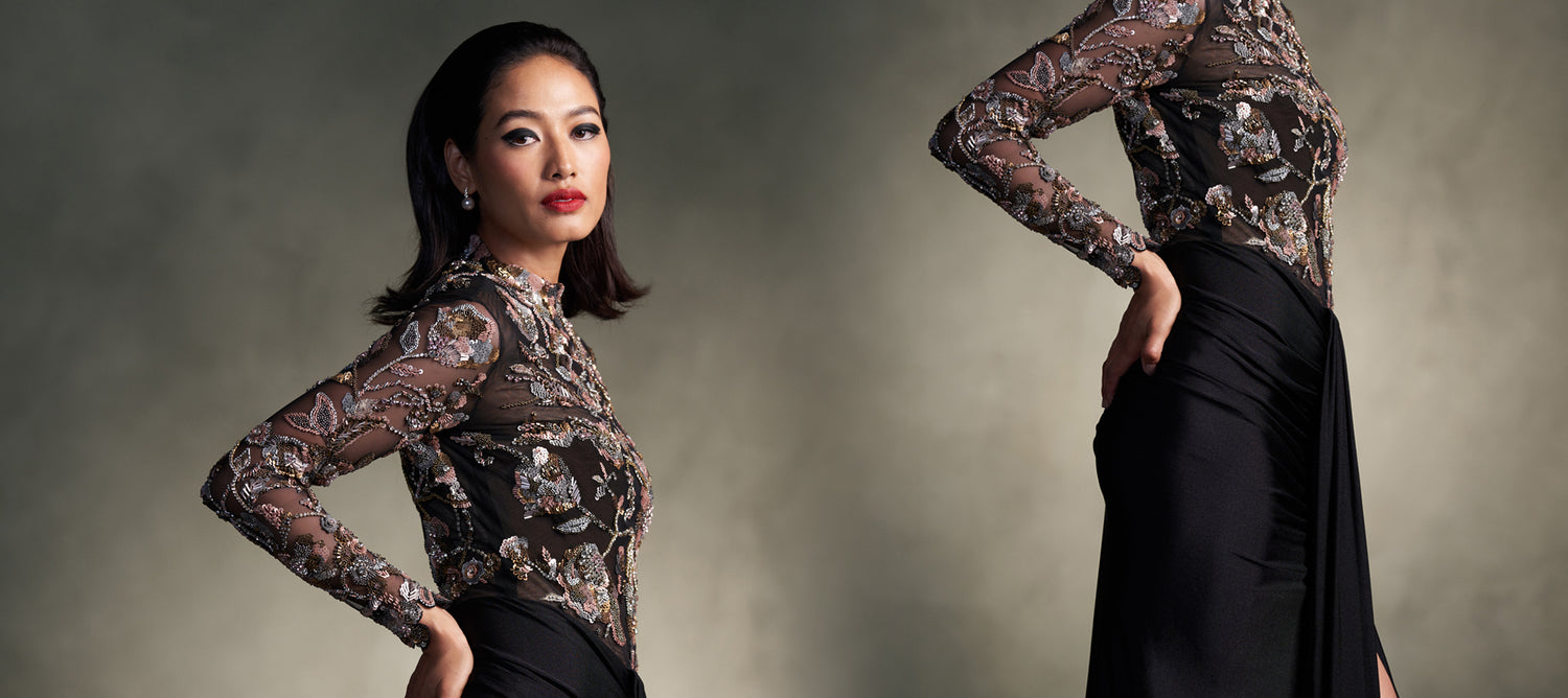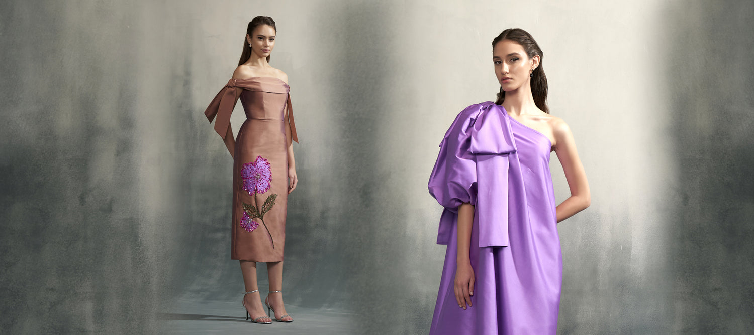 New season dresses , tops, bottoms and evening/cocktail wear from the latest collections by ATSU.Off-Shoulder Satin Gown With Contrast Bow Detail