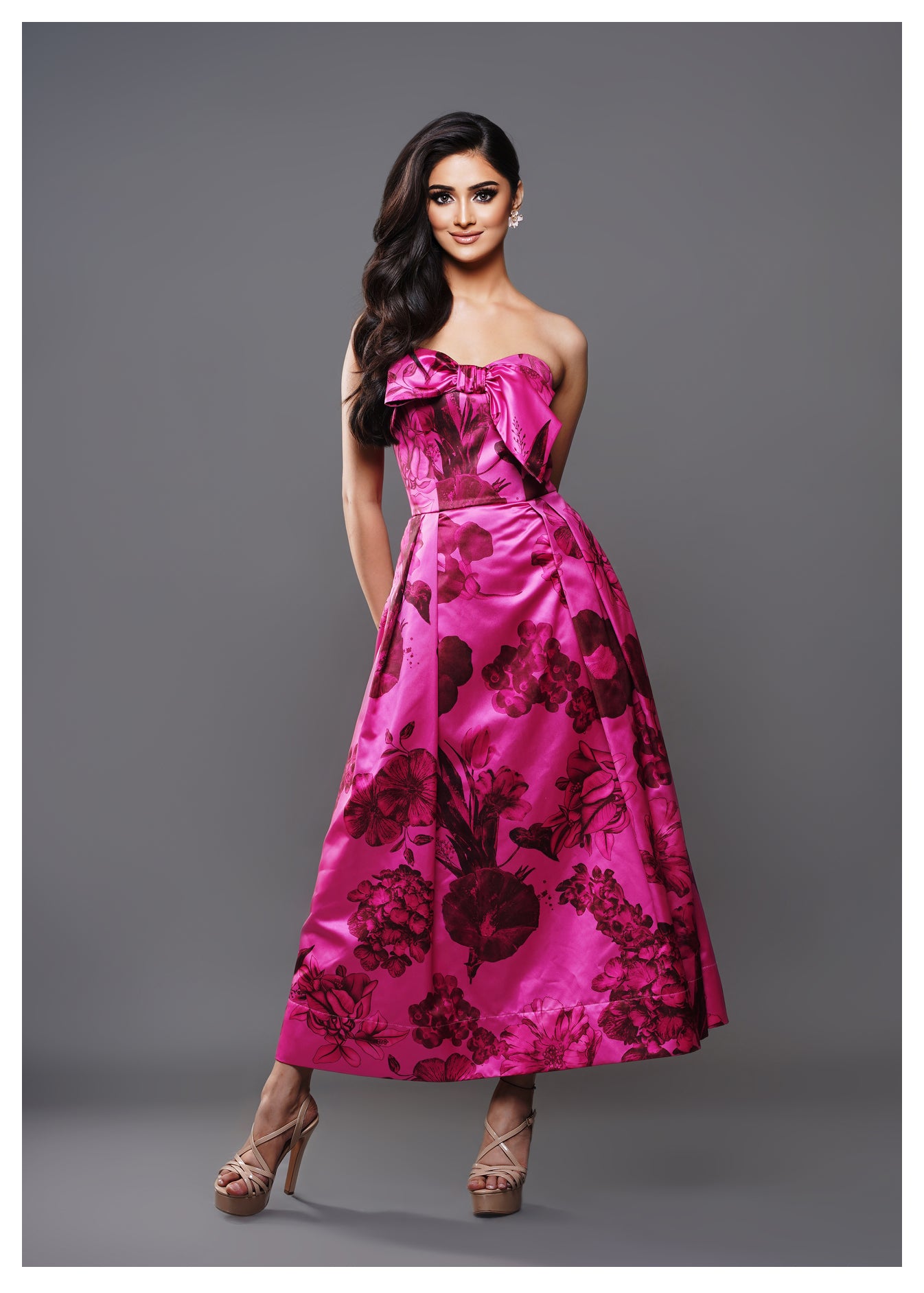 New season dresses , tops, bottoms and evening/cocktail wear from the latest collections by ATSU.Off-Shoulder Satin Gown With Contrast Bow Detail