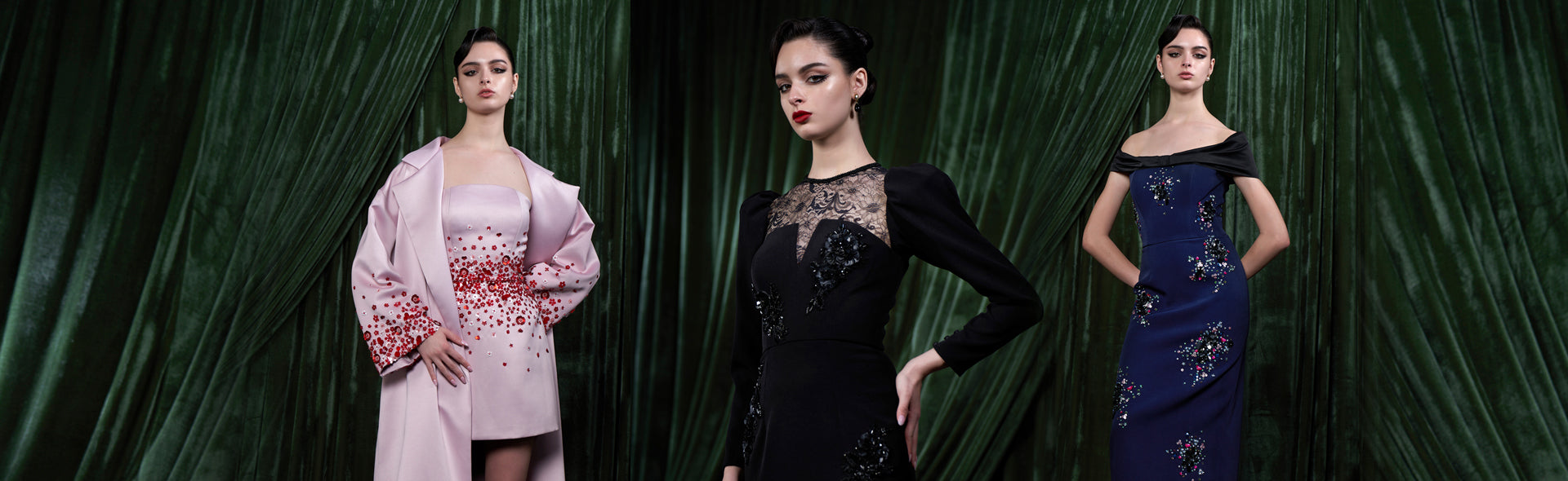 The collection presents a harmonious mix of dresses, skirts, blouses, jackets, and statement corset gowns, designed for women who embrace individuality with timeless elegance. From the shimmer of embellished florals to the playful drama of feathers, every piece speaks of artistry and refined craftsmanship.